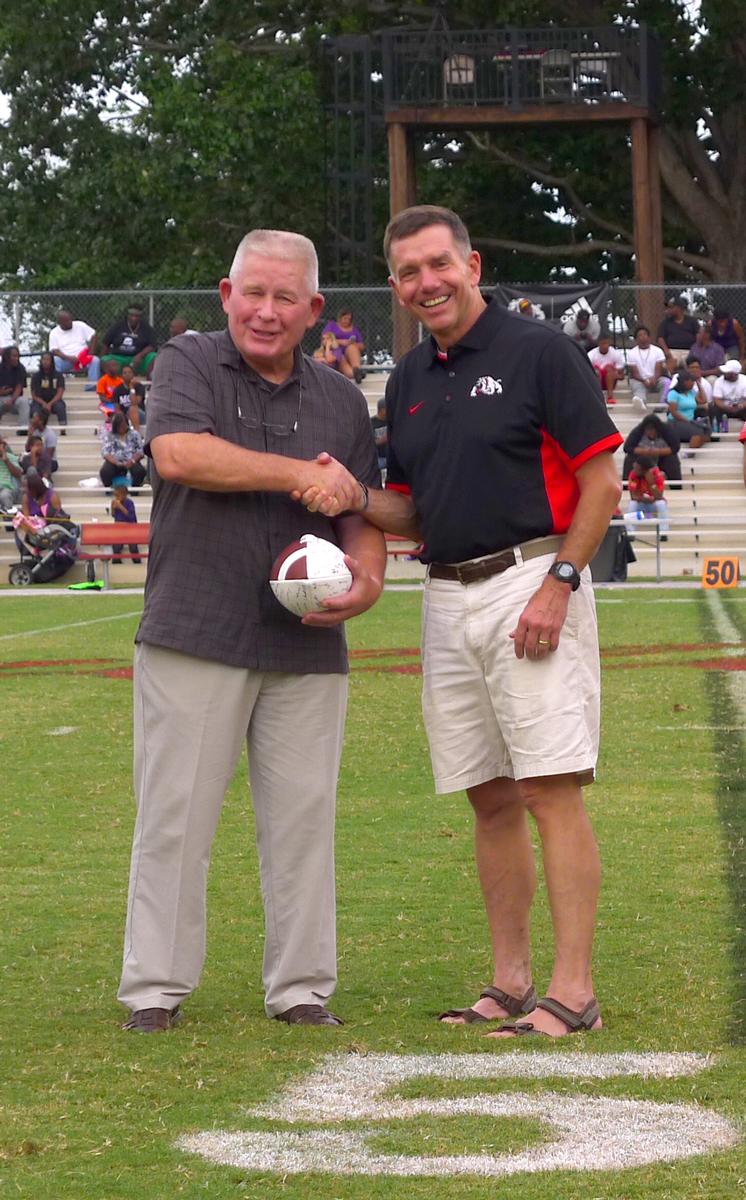 COL Fred Van Horn, USA (Ret.) was honored as an esteemed Georgia Military College staff member during the GMC football game on August 29, 2015. LtGen Caldwell and Coach Bert Williams presented him with a game ball, signed by every member of the GMC Football Team. COL Van Horn came to Georgia Military College after a long and distinguished career in the U.S. Army. With more than twenty years of service to GMC, COL Van Horn first served as the Commandant of Cadets and then for many years as the Executive Vice President to two GMC Presidents – Maj. Gen. Peter J. Boylan and LtGen William B. Caldwell, IV. COL Van Horn also served as Interim President, bridging the gap between the retirement of President Boylan and the induction of President Caldwell in 2013. As COL Van Horn considers retirement, he is focused on guiding GMC through their 10-year SACS Accreditation Review.