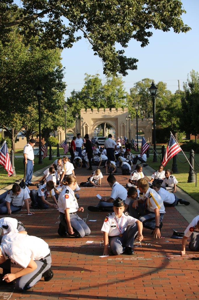 (GMC Prep cadets create a memorial on the North bricks by writing the names of 9/11 victims and those who perished in the Global War on Terrorism.)